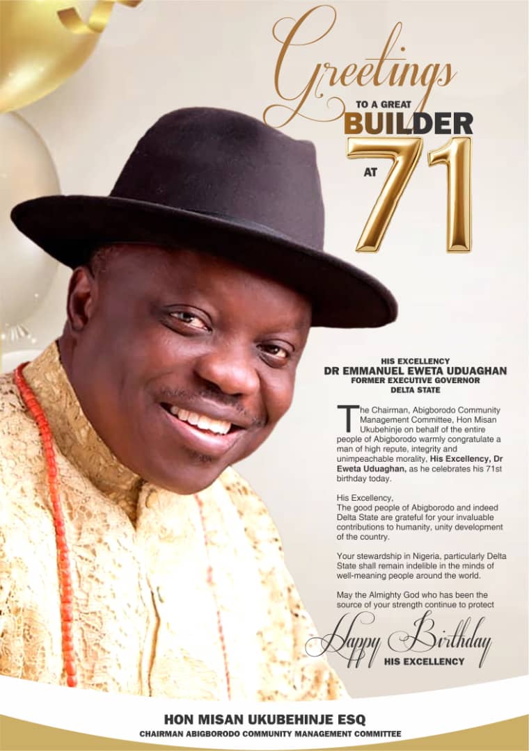 The leaders and the good people of Abigborodo warmly congratulate a man of high repute, integrity and unimpeachable morality, His Excellency, Dr Eweta Uduaghan, as he celebrates his 71st birthday today.